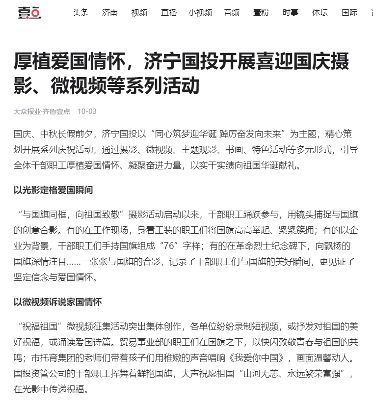 《齐鲁晚报·齐鲁壹点》| 厚植爱国情怀,济宁国投开展喜迎国庆摄影、微视频等系列活动
