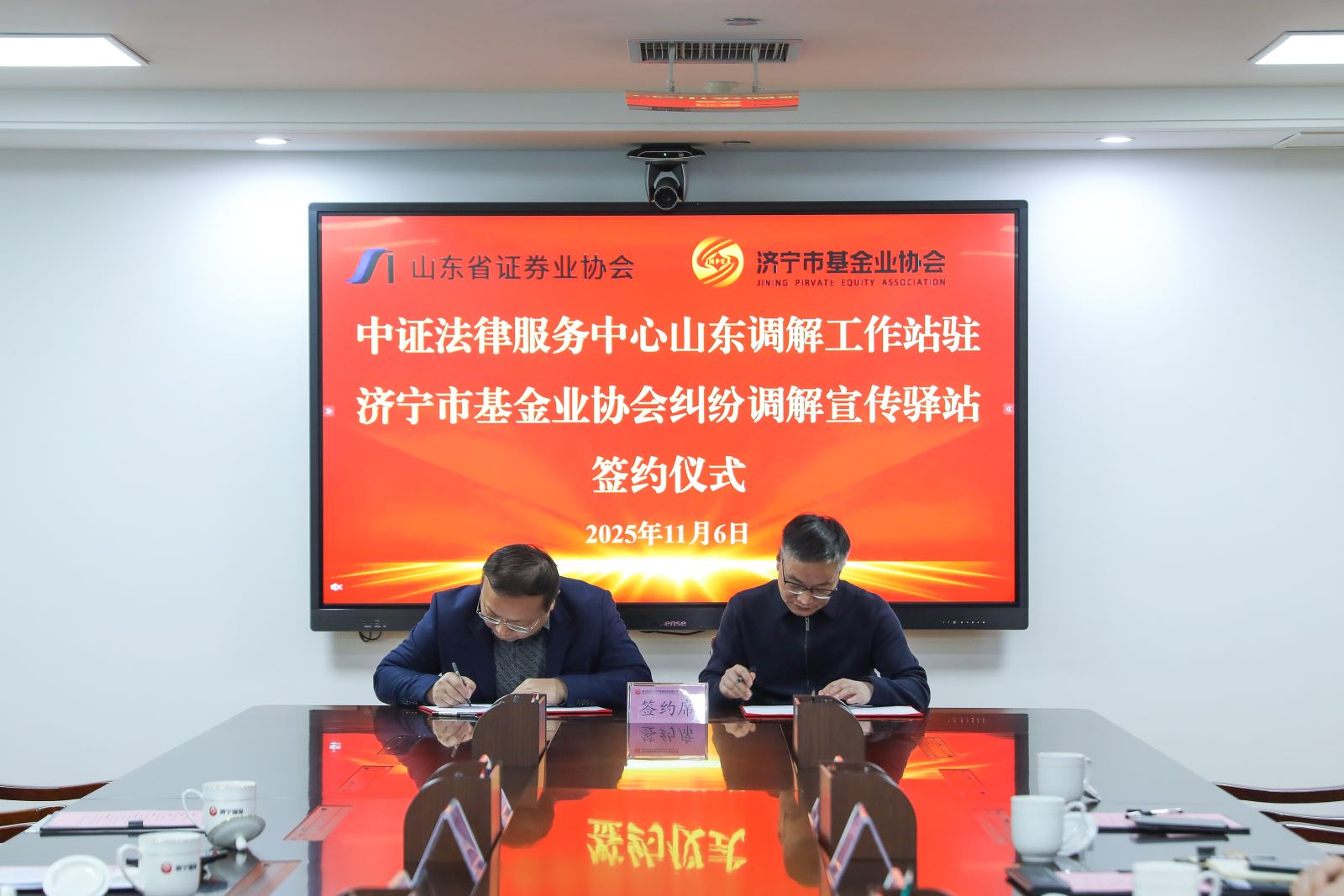 随后,郑家文与济宁市股权投资基金业协会常务副会长、秘书长宋斌亭共同签署合作协议。孙素美与赵劲松共同为“中证法律服务中心山东调解工作站驻济宁市基金业协会纠纷调解宣传驿站”揭牌。